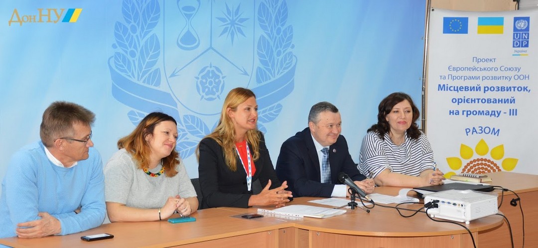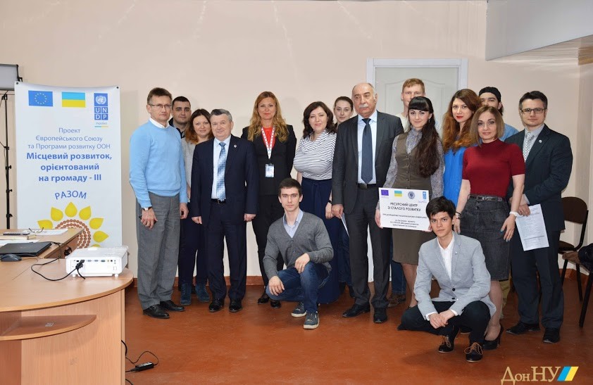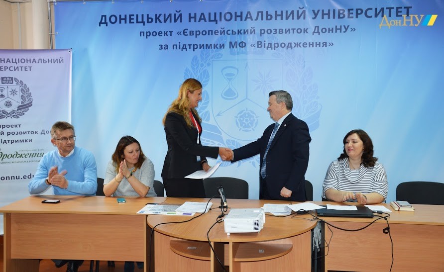 Того ж дня Світлана Слабінська зустрілася із представниками Донецького національного університету, що лише нещодавно приєднався до університетської мережі МРГ. Ректор ДонНУ Роман Гринюк вручив підписаний меморандум про порозуміння між ПРООН і ДонНУ та повідомив, що вже підписав розпорядження про створення інформаційно-ресурсного центру для поширення заходів, спрямованих на активізацію сталого розвитку, децентралізацію та реалізацію конституційного права територіальних громад на управління своєю територією, сприяння сталому регіональному розвитку шляхом навчання майбутнього покоління, а також активізації науково-дослідницької діяльності цій сфері. Для ресурсного центру вже виділено просторе приміщення і вже готова табличка, яку символічно презентували на зустрічі з Проектом МРГ. Викладачі і студентство університету-переселенця налаштовані на активну участь та інтеграцію у заходи університетської мережі.